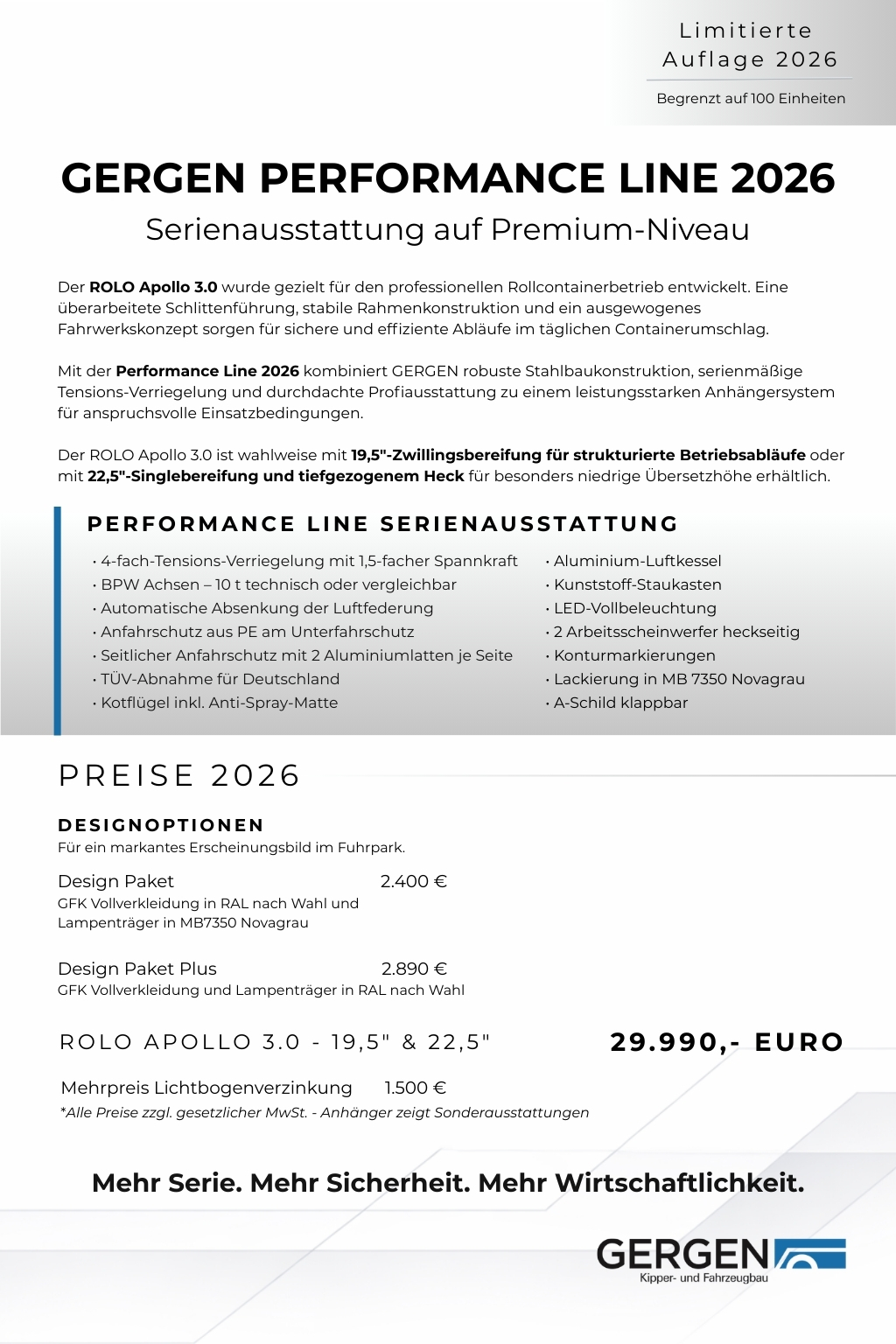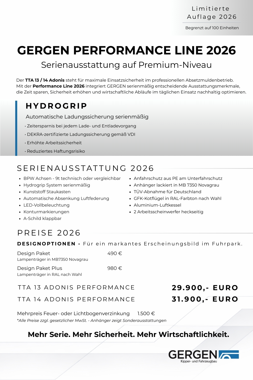 GERGEN baut seit über 85 Jahren qualitativ hochwertigste Produkte in den Bereichen Absetzkipper, Abrollkipper, Silosteller und Anhänger. Aufgrund unserer langjährigen Erfahrung und unseres innovativen Entwicklerteams, können wir den Markt immer wieder mit revolutionären Entwicklungen bereichern.